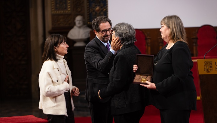 Durante el acto de homenaje, el Paraninfo aplaudió de pie la entrega de la Medalla de Oro de la UB a título póstumo.